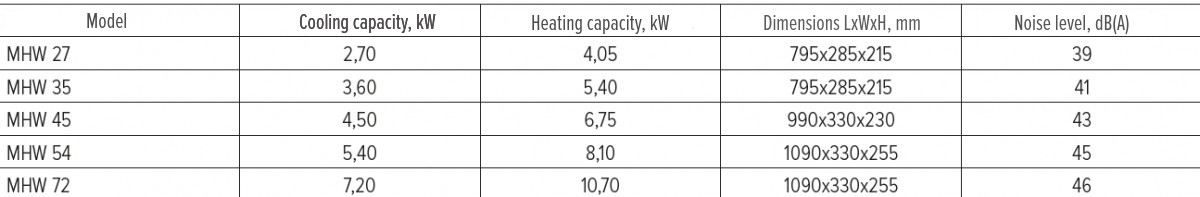 The universal design of wall-mounted fan coil units from the MHW series provides for quick and easy installation in any kinds of premises. These fan coil units do not harm the environment or human health in any way due to environmentally friendly plastic casing. A wireless infrared remote control allows to control the installation in a convenient way.