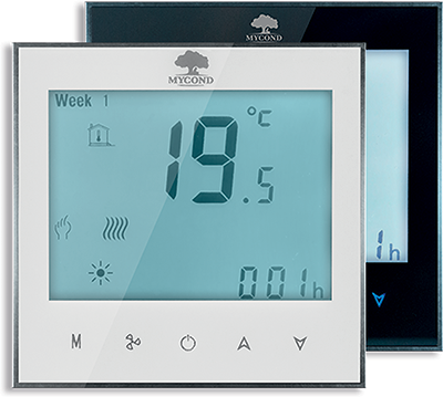 Работа системы фанкойлов может программироваться с помощью этого терморегулятора. Скачав на смартфон бесплатное приложение My Smart Thermostat, можно управлять системой фанкойлов удаленно. Опционально - возможна связь по Modbus.