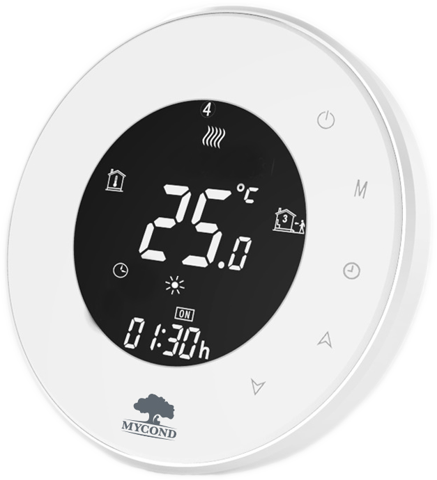 Терморегулятор MYCOND ORB Heat - незаменимый элемент для энергоэффективного отопления дома. С его помощью выбираются почасово экономные температурные режимы и программируется недельный график работы системы электрокабельного обогрева, чем достигается максимальная экономия расходов (более 30%) на обогрев дома. Снижение затрат достигается также за счет выгодного экономного режима, на который переходит система отопления, когда никого нет дома.