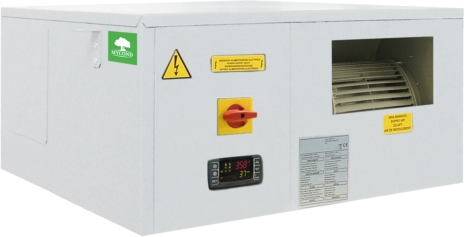 Осушительные установки рассчитаны для монтажа вне помещений бассейнов, в технических соседних с бассейном помещениях, соединенных с системой воздухозабора и распределения воздуха над зеркалом бассейна скрытой системой воздуховодов. Для подсоединения к всасывающему и нагнетательному воздуховодам имеется высоконапорный радиальный вентилятор.