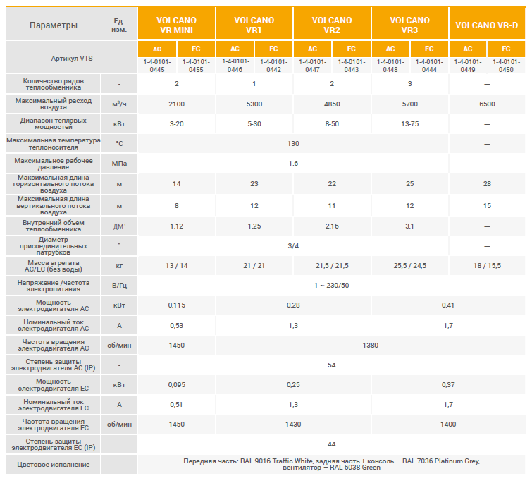 Воздушно-отопительные тепловентиляторы серии Volcano – это инновационное отопительное решение, основанное на применении водяных теплообменников, сочетающее в своей конструкции высокотехнологические компоненты и промышленный современный стиль. Расход подогретого воздуха - от 2100 до 6500 м3 /час. Предлагаются варианты исполнений: стандартный (с AC-вентилятором) и энергоэффективный с гибким регулированием производительности (с EC-вентилятором). Улучшенная форма рабочего колеса вентилятора и регулируемый ЕС-электродвигатель дают возможность экономии электропотребления до 40%.