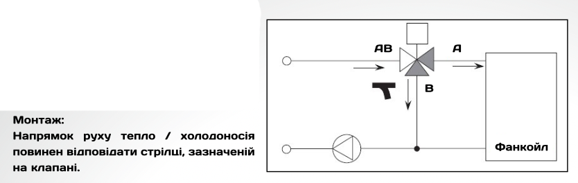 Mycond three-way valves are used to control delivery of fan coil units by opening/closing the flow passage for the heat-carrying and coolant fluid. The valve is provided with a return spring. The valve is normally closed. Once the thermal drive is powered up, the valve opens. When the actual indoor air temperature reaches the set parameters, the thermostat of the fan coil unit cuts off the power supply to the thermal drive of the valve. This cuts off the supply of heat-carrying and coolant fluid to the fan coil unit. By sequential closing/opening of the valve, constant air temperature is maintained. The drive is attached to the valve by a threaded joint. After the valve is fixed on the main pipeline, the drive can be mounted on the valve. It is advisable to mount the valve on the main pipeline using 1/2″ and 3/4″ flexible joints.