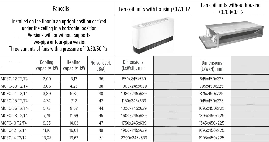 Universal MCF fan coil units have wide application possibilities. More often units of this type are installed on the floor in an upright position or fixed under the ceiling in a horizontal position (with a minimal free under-ceiling space). For installation in suspended ceiling, fan coil units without frame are used.