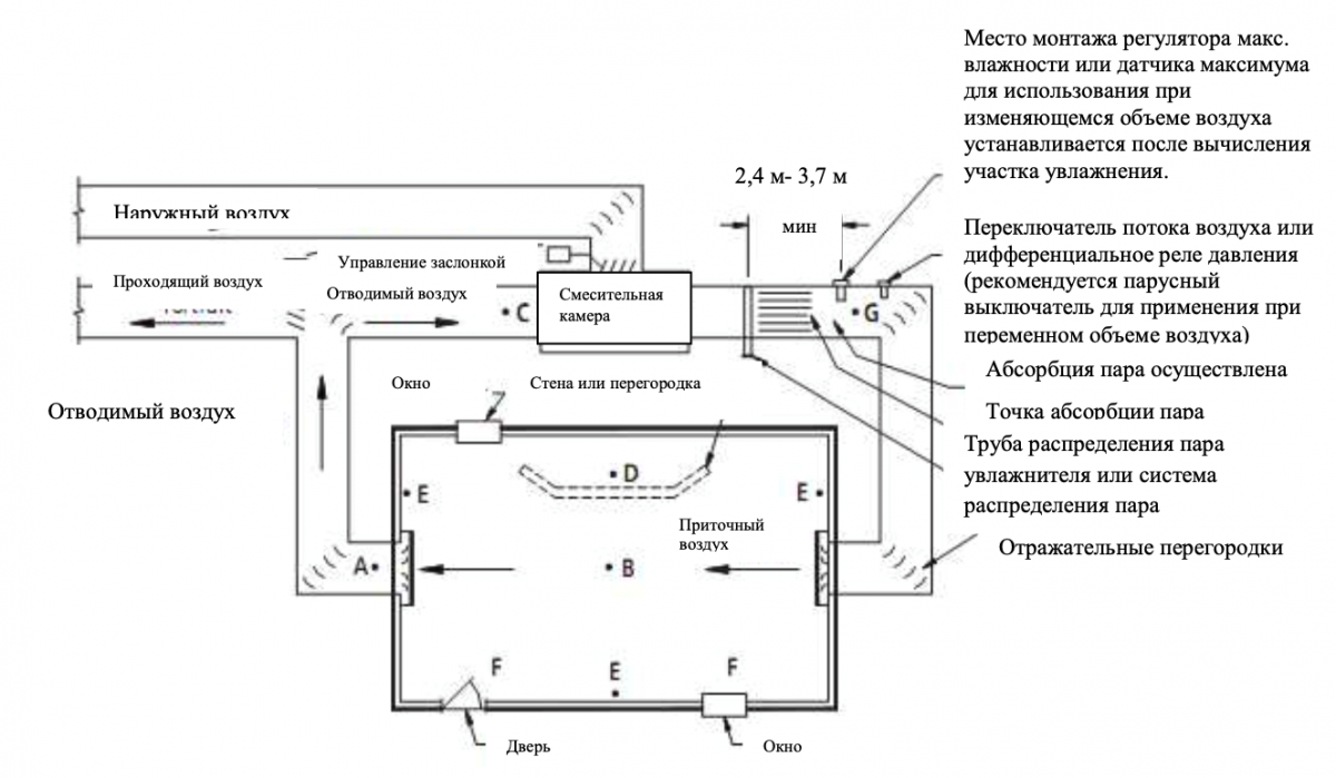- D, Е, F — в этих местах не рекомендуется установка гигростатов или датчиков влажности.