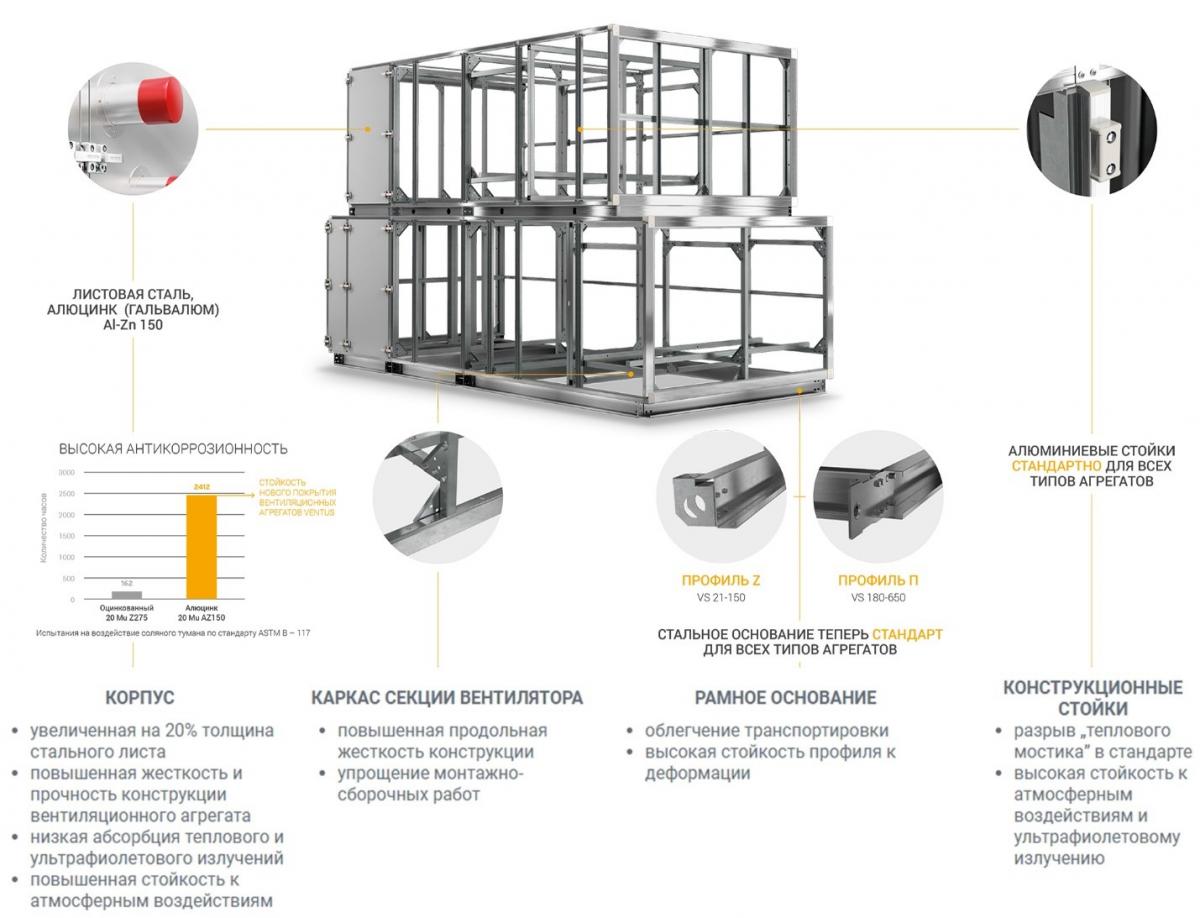 Корпус агрегатов для подготовки воздуха серии VENTUS VVS представляет собой надежную конструкцию с прочным стальным опорным каркасом в стандартном исполнении и уникальными алюминиевыми стойками с ребрами жесткости, термическими вкладками и уплотнениями. Стенки корпуса выполнены как сендвич-панели, заполненные пенополиуретаном и покрытые стальными листами, защищенными антикоррозийным покрытием (алюцинк AZ 150).