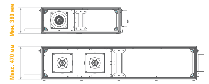 Такие вентиляционные агрегаты монтируются в конструкции подвесных потолков, занимая пространство по высоте не более 470 мм.