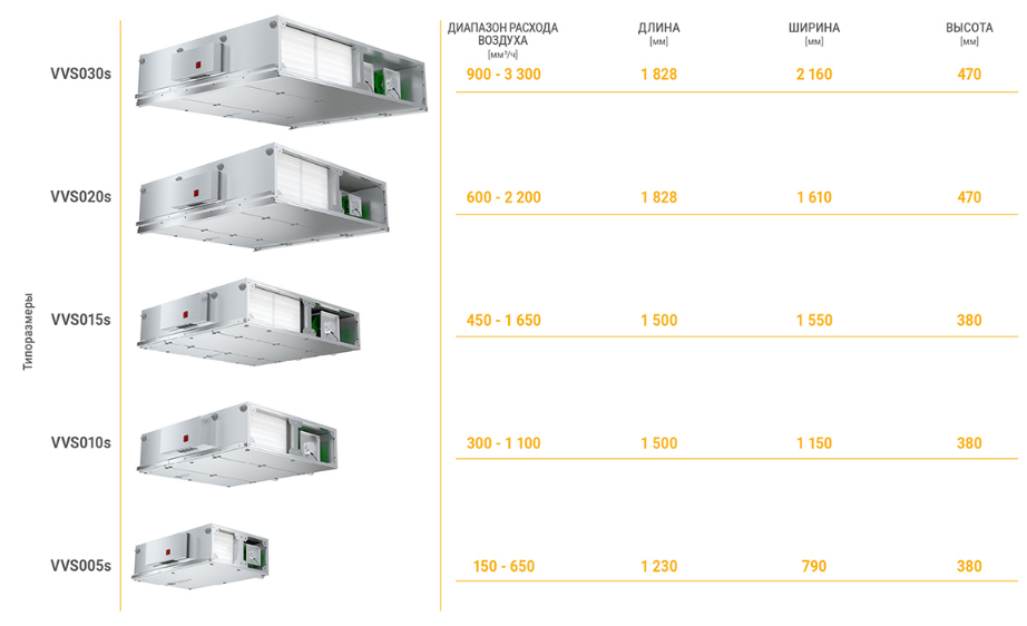 Размеры и производительность подвесных агрегатов VTS VENTUS COMPACT
