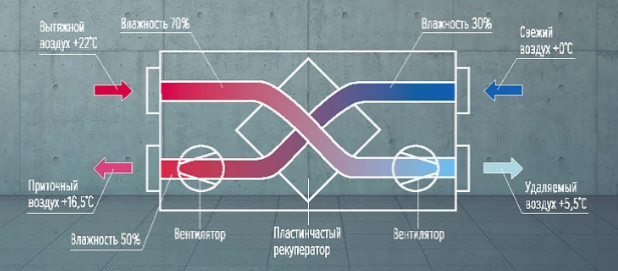 Работа вентиляционной установки заключается в регулируемой подаче свежего воздуха в помещения по одной сети воздуховодов и удалении отработанного воздуха в противоположном направлении по другим воздуховодам - из помещений. Вытяжной поток, проходит через пластинчатый рекуператор, где передает тепло (влагу) входящему воздуху.