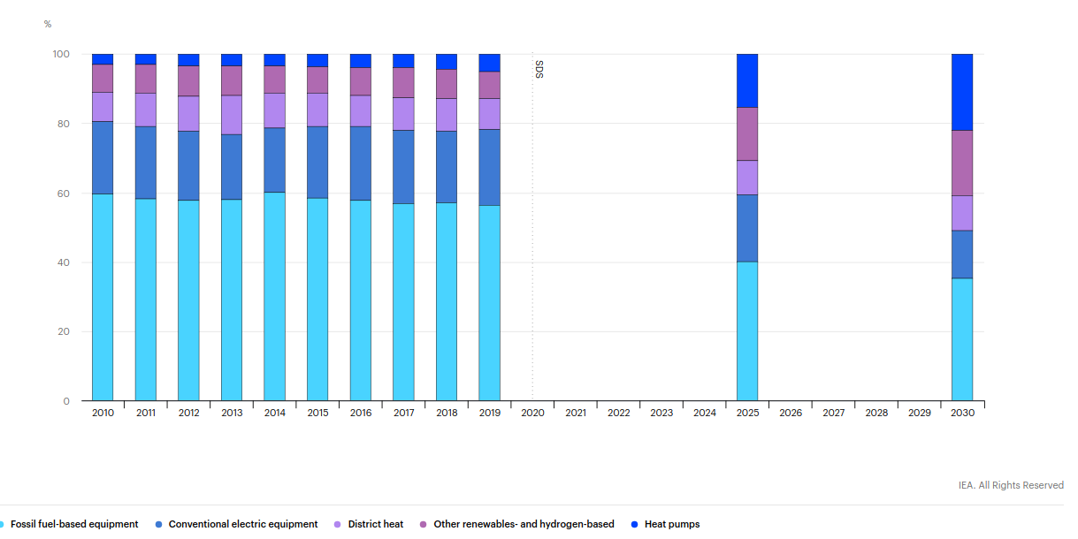 В 2019 году в частных домах установлено 20 миллионов тепловых насосов. Прогресс очевиден на всех рынках первичного отопления в Северной Америке, Европе и Северной Азии. На данный момент, тепловые насосы становятся самой передовой и распространенной технологией для вновь построенных домов во многих странах. Но они удовлетворяют лишь 5% мировой потребности в отоплении зданий. Поскольку согласно планов эта доля должна утроиться к 2030 году, требуется развитие в дальнейшем этих инноваций при политической поддержке ведущих стран.  Необходимо развивать технологии, чтобы повысить энергоэффективность ТН, снизить затраты на их закупку и установку, устранять рыночные барьеры для сервиса.