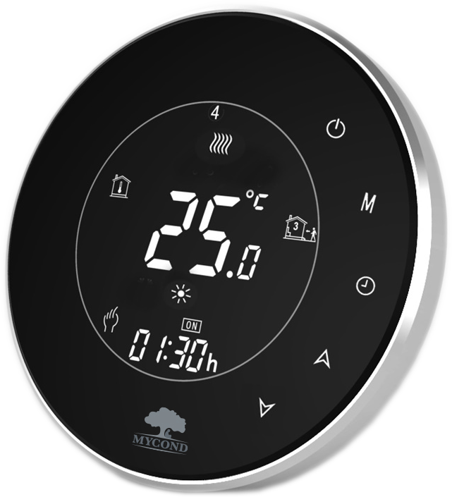 Терморегулятор MYCOND ORB Heat - незаменимый элемент для энергоэффективного отопления дома. С его помощью выбираются почасово экономные температурные режимы и программируется недельный график работы системы электрокабельного обогрева, чем достигается максимальная экономия расходов (более 30%) на обогрев дома. Снижение затрат достигается также за счет выгодного экономного режима, на который переходит система отопления, когда никого нет дома.